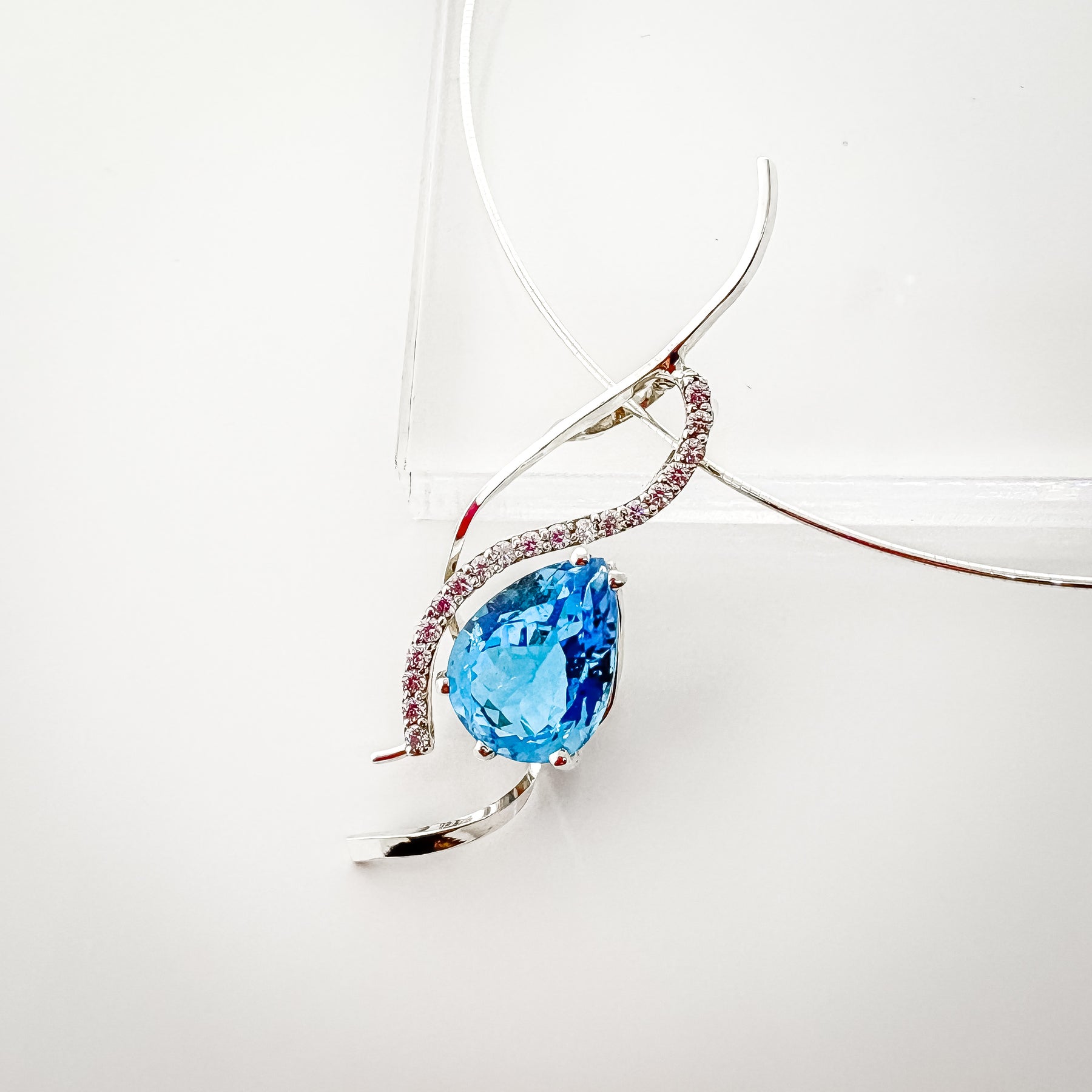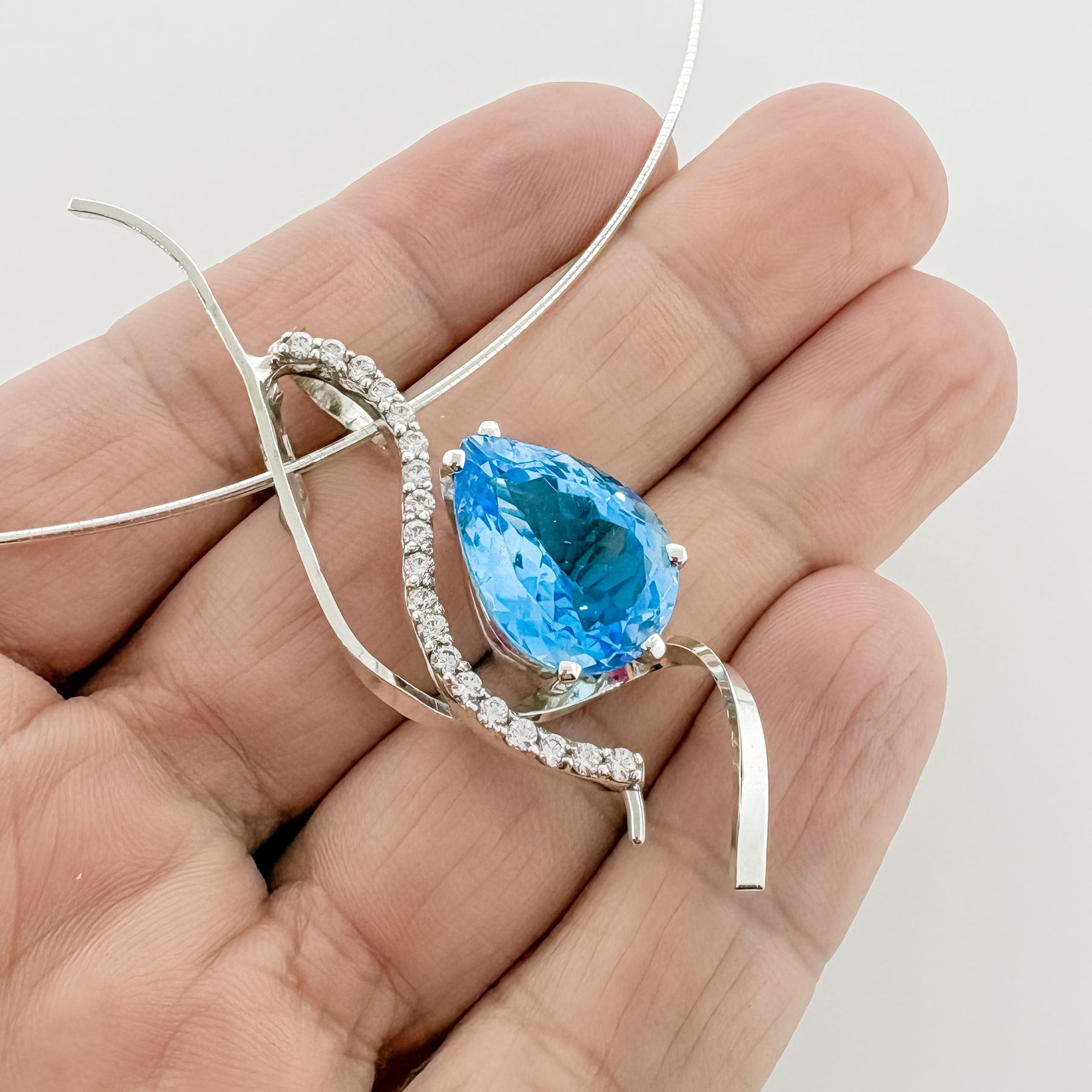 Celebrate the beauty of artisan craftsmanship with this handmade Sterling Silver Pear-Shaped Blue Topaz Pendant. This piece is individually crafted by hand, featuring a brilliant pear-cut blue topaz set in flowing sterling silver lines that create a soft, feminine silhouette. Sparkling white accent stones add a touch of elegance, enhancing the gemstone’s natural radiance.